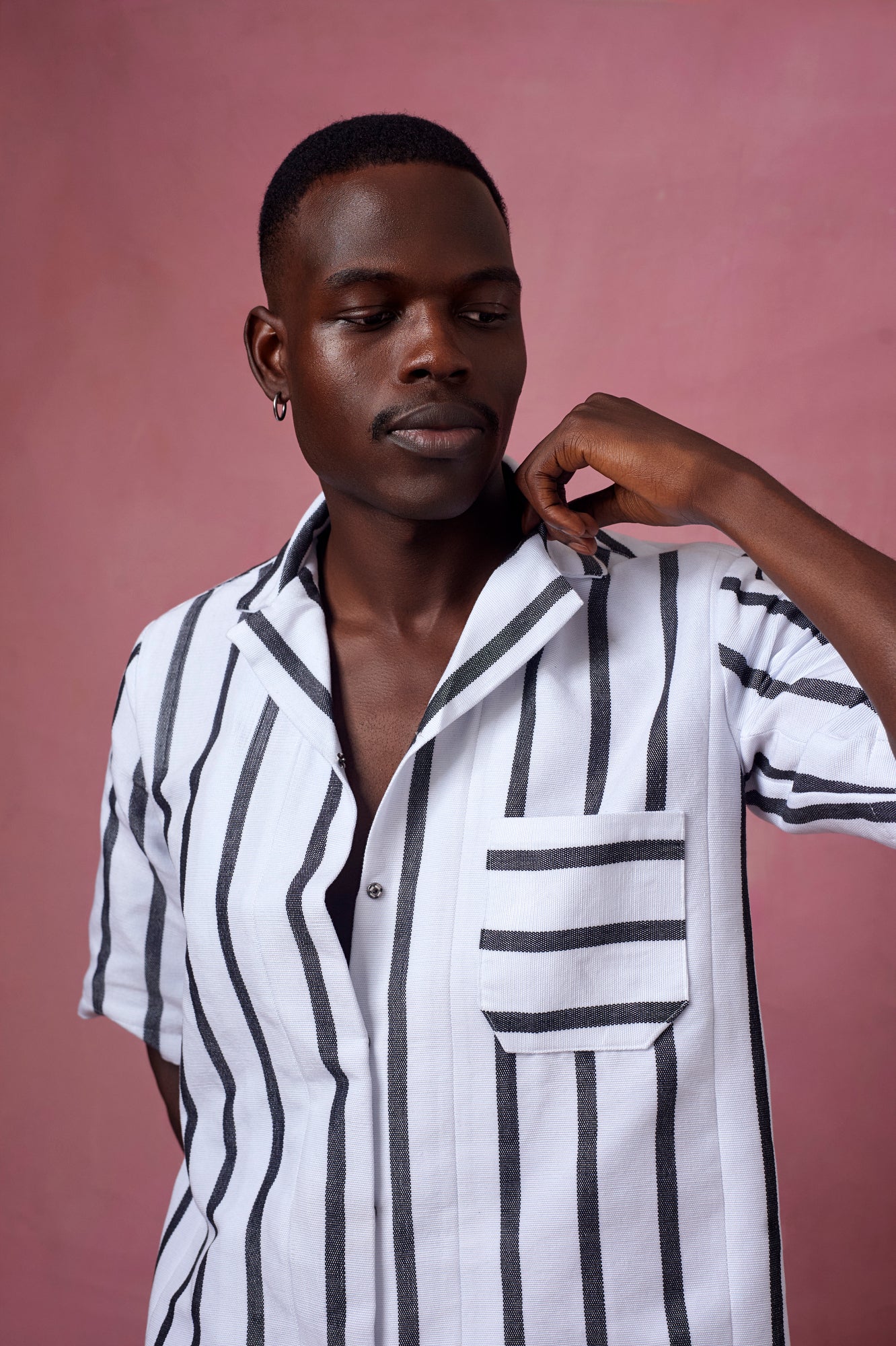 The camp-collar shirt features a relaxed silhouette and vertical monochrome stripes that elongate and flatter, making it an effortlessly cool statement piece. Paired with our culotte trousers, which offer structured volume and breathable comfort, the look feels both grounded and elevated.